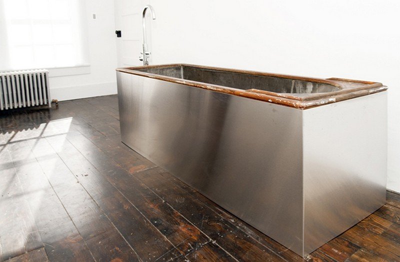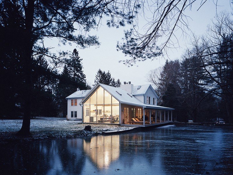 Sited at the edge of a pristine creek, with a waterfall cascading over an ancient dam of hand-laid stone, the Floating Farmhouse was a sinking ship when first discovered. After a design and rebuild process spanning four years, the 1820 manor home is now a study in contrasts: fully restored to its period grandeur while featuring purely modernist elements, including a curtain wall of skyscraper glass in the kitchen, polished concrete and steel finishes, minimalist interiors, and a cantilevered porch “floating” on the surface of the water.