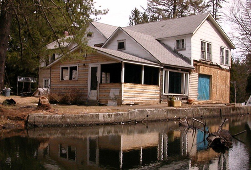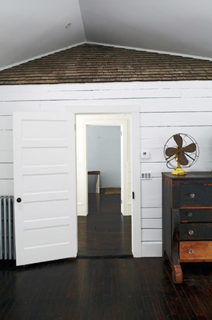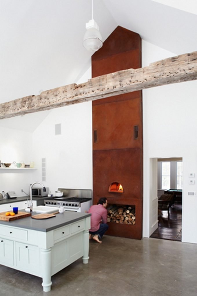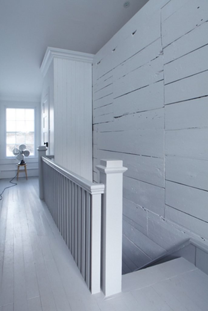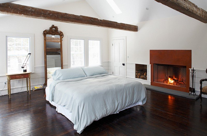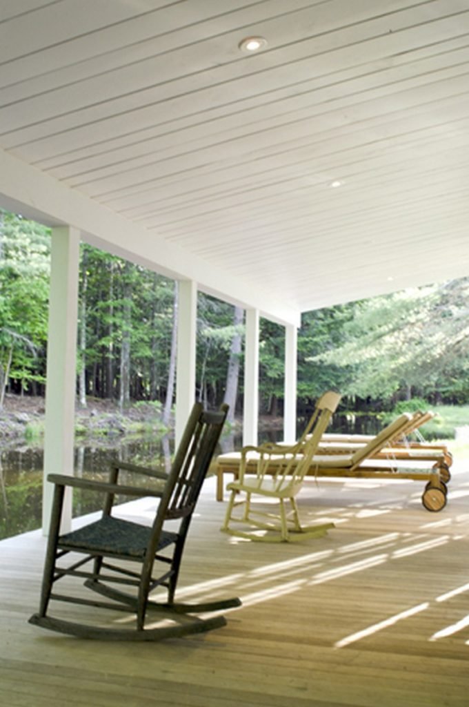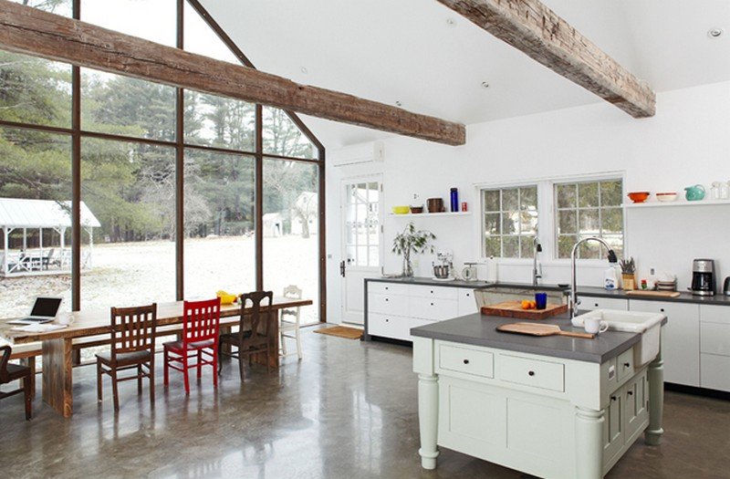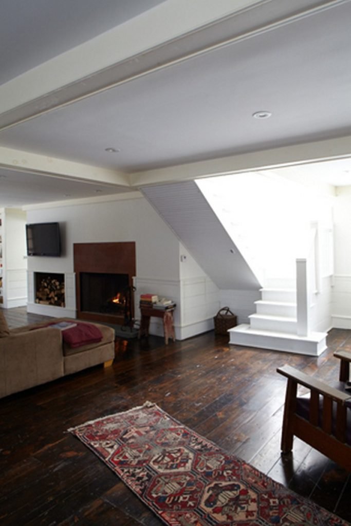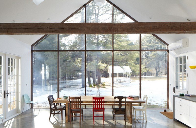 All the woodwork throughout the home, including the covered porch ceiling, was created from towering pines felled and milled on the property. The original clapboard siding and wavy-glass windows have been fully restored and a pair of centuries-old hand hewn ceiling beams, salvaged from a Pennsylvania dairy barn, anchor the vaulted space.