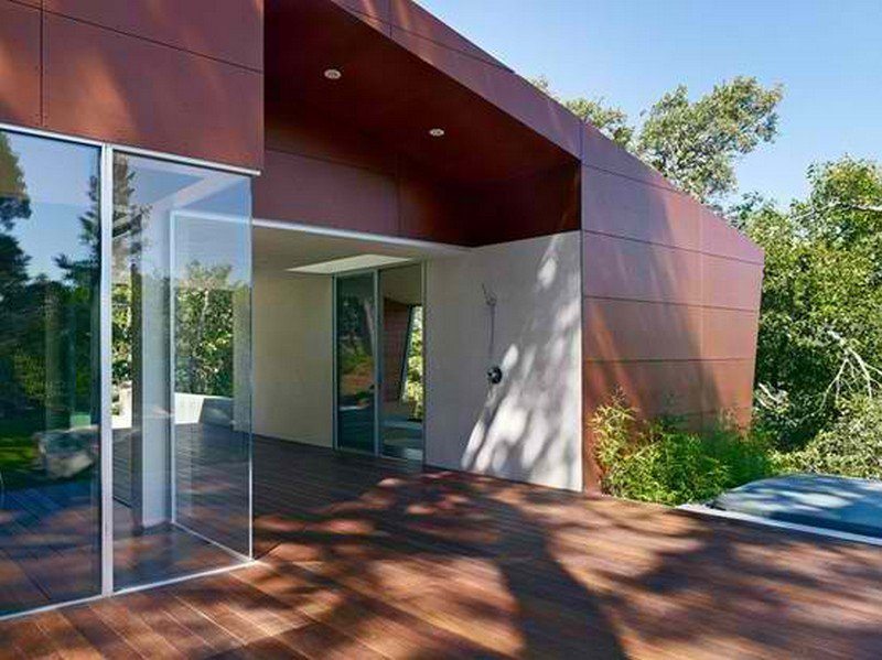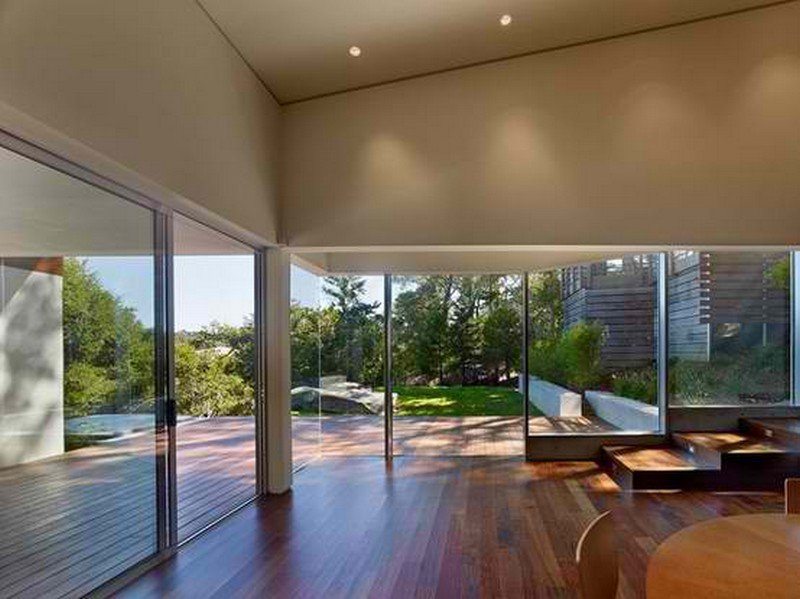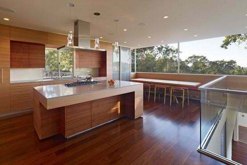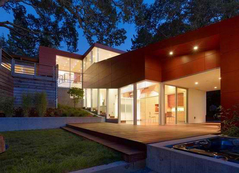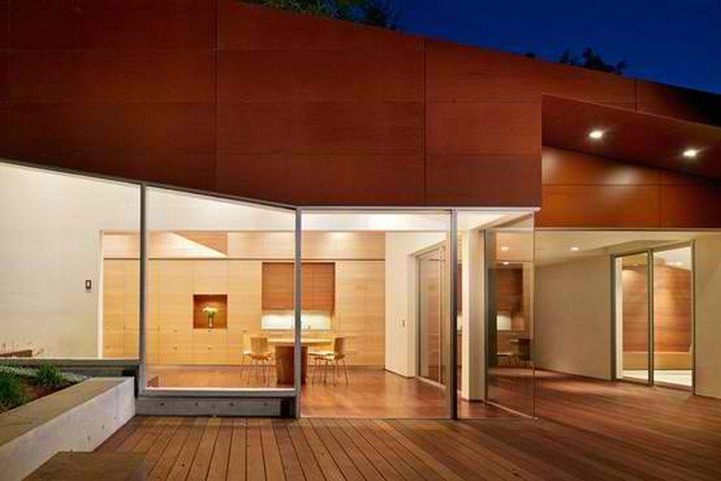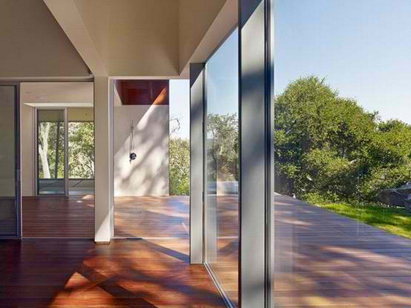 Situated in a pocket of oak woodlands in Northern California’s Portola Valley, the original house had endearing elements well worth preserving.  Incorporating green design throughout, the new addition gently cascades down the hill, echoing the natural slope of the topography.  Floor to ceiling windows showcase breathtaking views of one of the most famous valleys in the world – Silicon Valley.