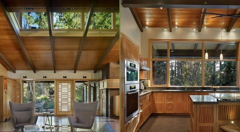 Nils Finne spent his childhood amongst the timber homes of Norway. His respect of and love for the medium shines through in this home, a renovation of a 1950’s house, located on a secluded, wooded site about 25 miles (40 klms) north of Seattle. The ‘Northwest Contemporary’ style home has been completely renovated yet stays true to the spirit of the original house. With extensive new windows and glazed roof monitors, the renovated house stands like a glass pavilion in the forest.