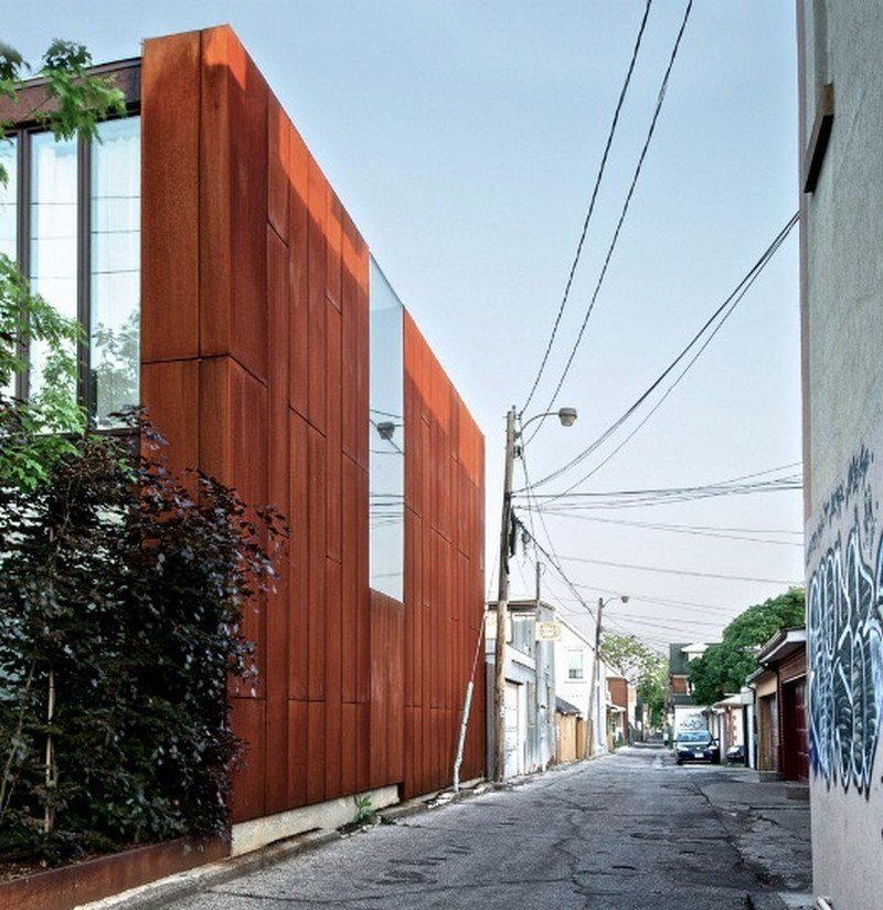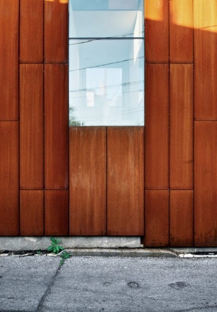 The alley from Dupont hugs the side of the building leading to a colourful urban patchwork of garages, concrete and utility poles. By obscuring the front, the side, clad in Corten steel with a single high window, becomes the prime elevation
