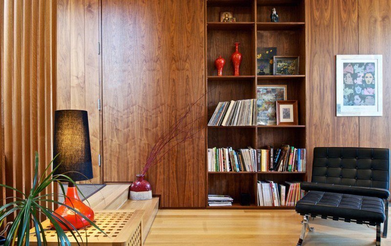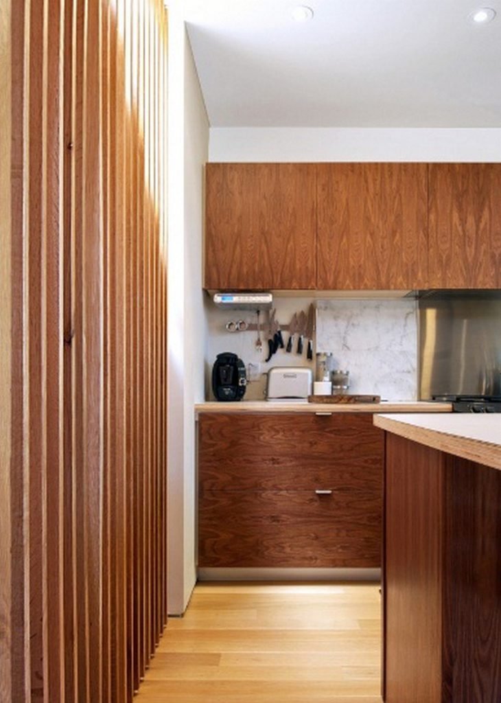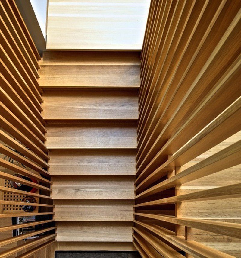 The front and rear elevations employ stacks of mahogany windows and doors. Due to its proximity to the street, the building features large screened glass walls and planting to hide the interior living space. The ground floor opens to a pair of courtyards at both the front and back of the residence.