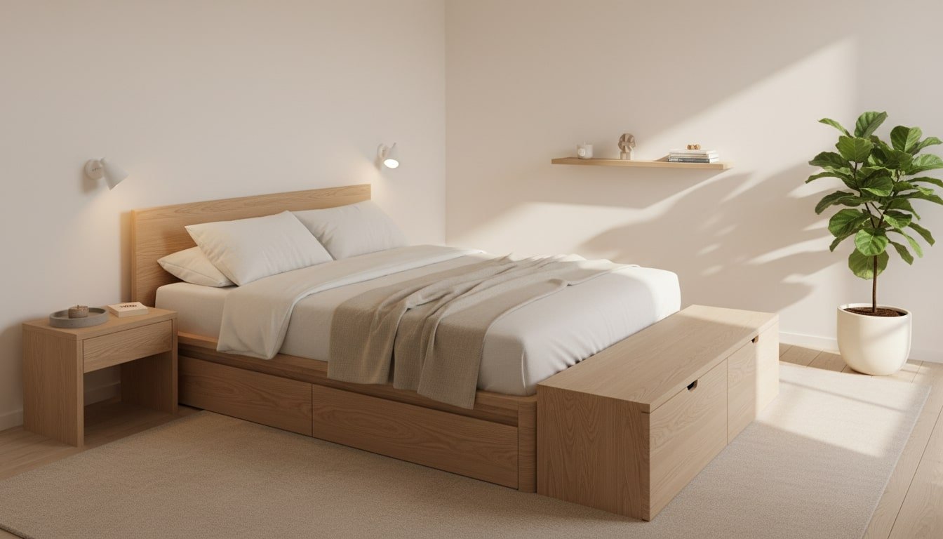 If the room is small, focus on vertical space and multipurpose pieces. Wall-mounted shelves can replace bulky nightstands, and sconces can free surface space while improving bedside lighting. A storage bed or under-bed bins can increase capacity without adding furniture.