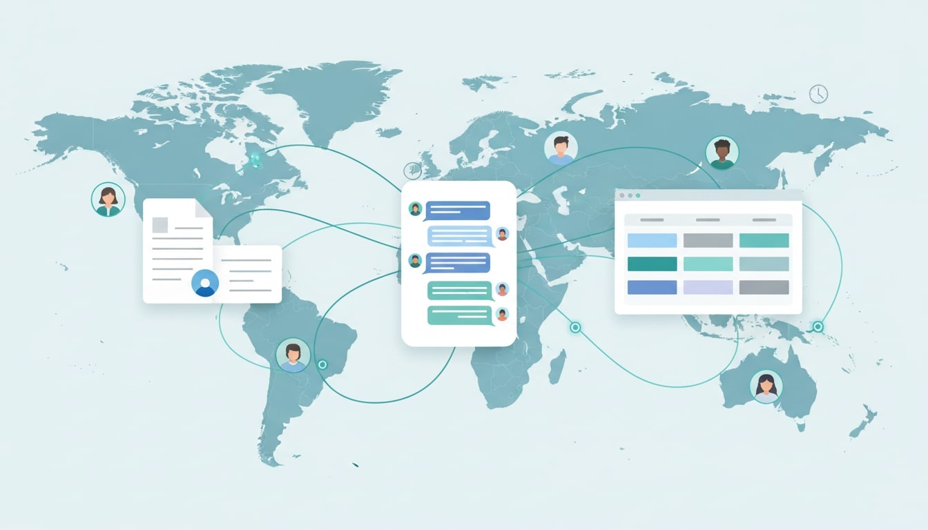 Conceptual world-map illustration with floating documents, chat threads, and task boards.