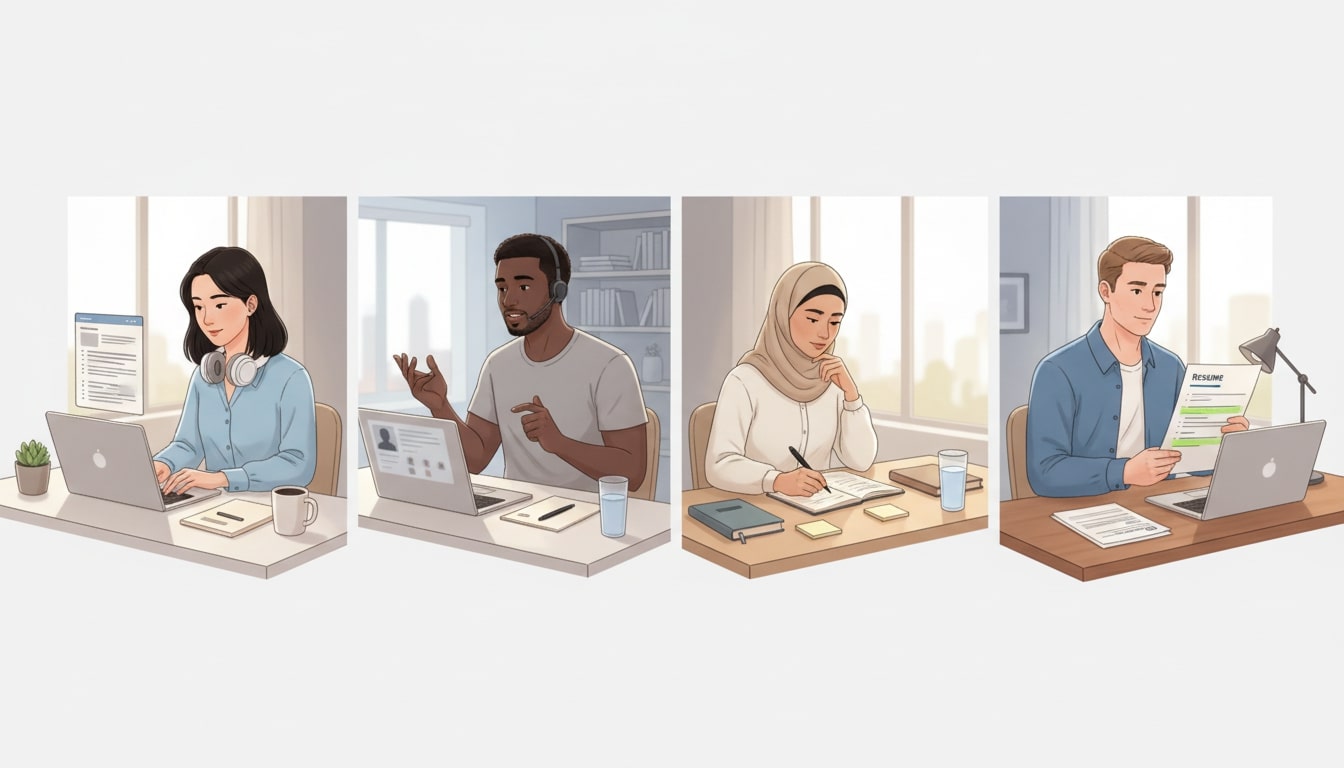 A wide, cohesive scene with four diverse remote professionals at separate desks, all in one continuous virtual workspace.