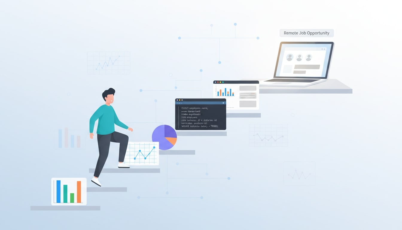 Analyst climbing steps made of charts, SQL code, and dashboards toward a “remote job opportunity” laptop.