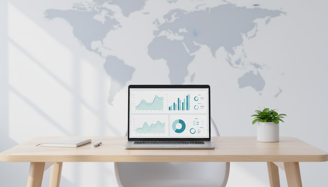 Minimalist laptop on a clean desk with multiple dashboards and a subtle world map in the background.